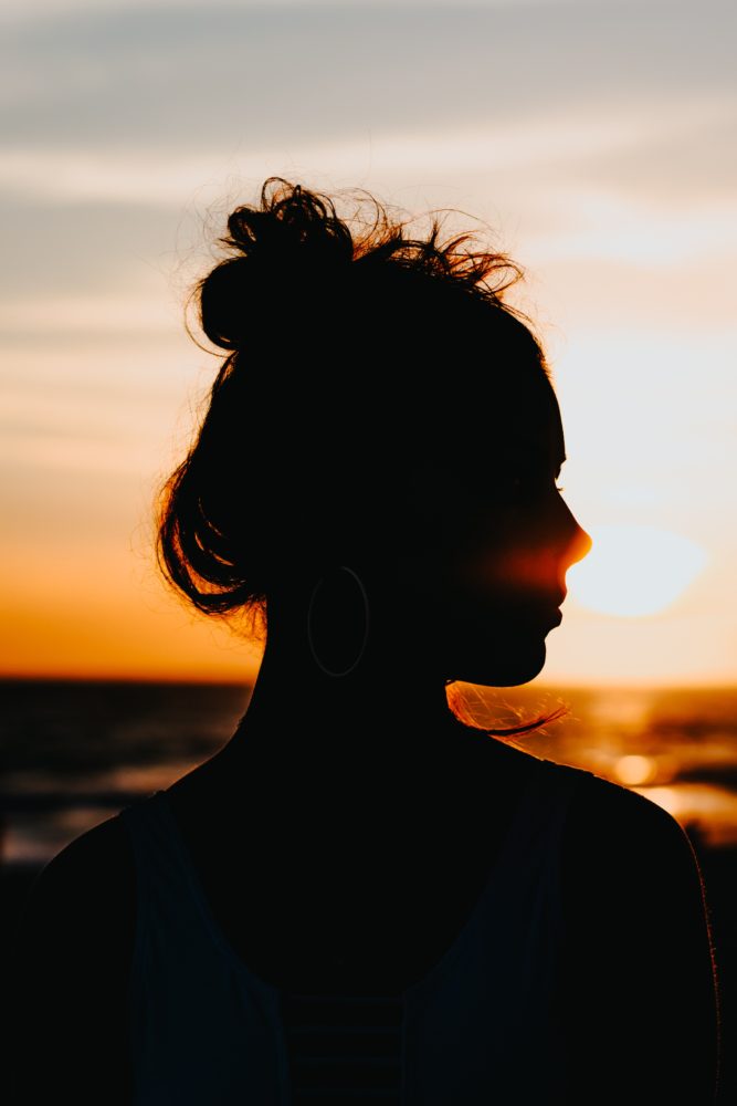 Silhouette of a female standing on the coast of the sea with a beautiful sunset in the background
