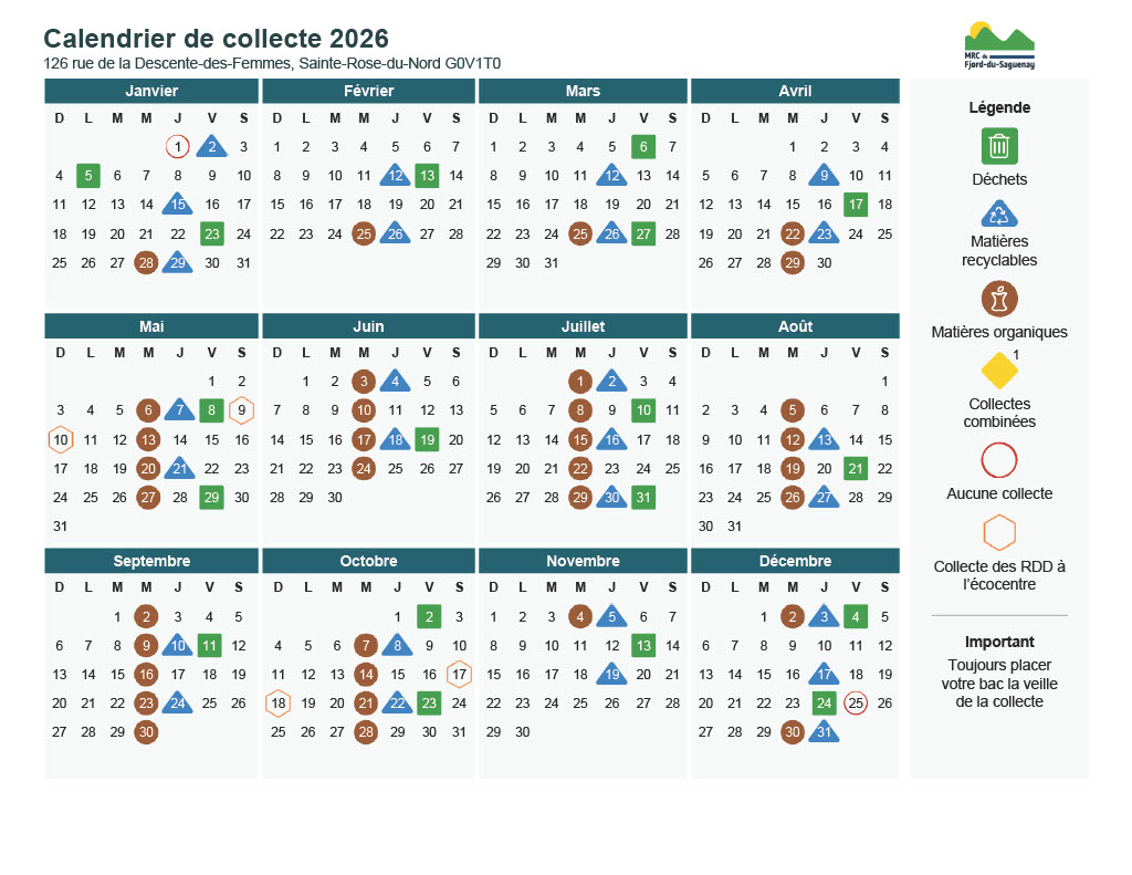 La gestion des matières résiduelles sur le territoire de Sainte-Rose-du-Nord est sous la responsabilité de la MRC du Fjord-du-Saguenay.